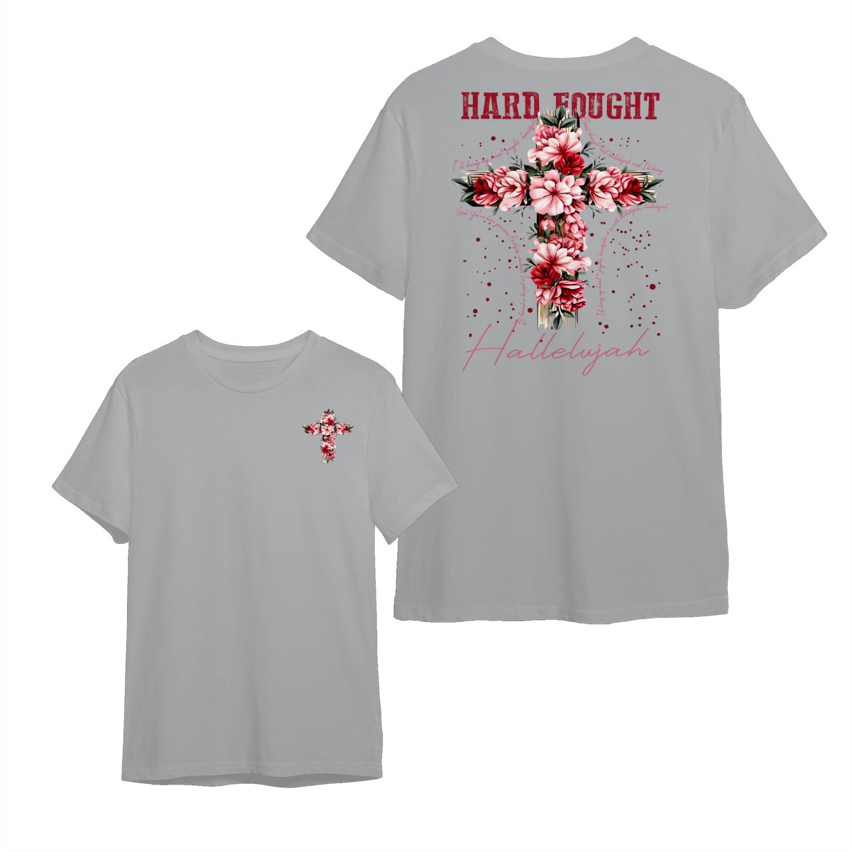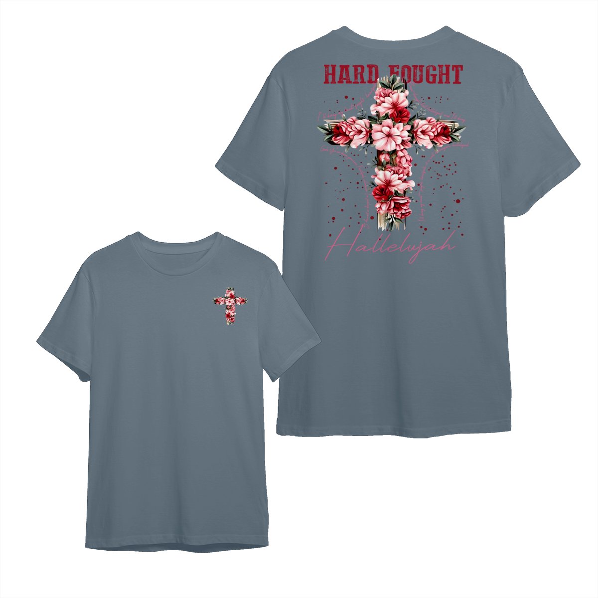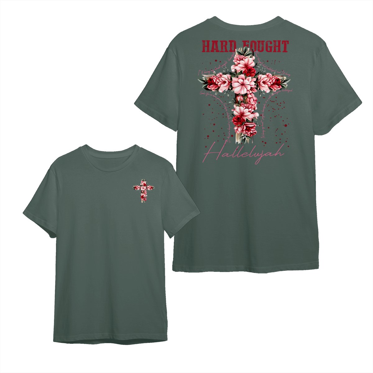 Are you looking for some special gift Hard Fought Hallelujah T-Shirt – Inspirational Floral Cross Graphic with Faith Message, Christian Gift Menswear Tee for your friends, your father, your mother, son, boyfriend, girlfriend? We have this idea for you. This product Hard Fought Hallelujah T-Shirt – Inspirational Floral Cross Graphic with Faith Message, Christian Gift Menswear Tee is perfect for you. Our T-shirt made of ringspun cotton for smoothness and body, and added rayon and polyester for extra stretch, drape, and breathability, this will be your new favorite t-shirt.