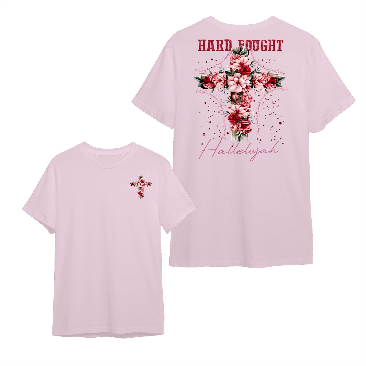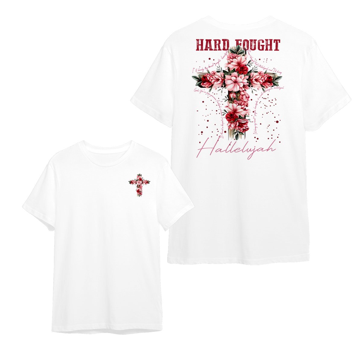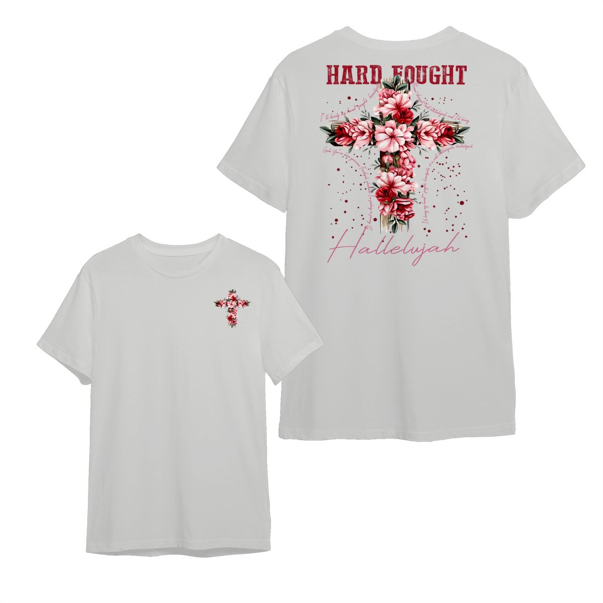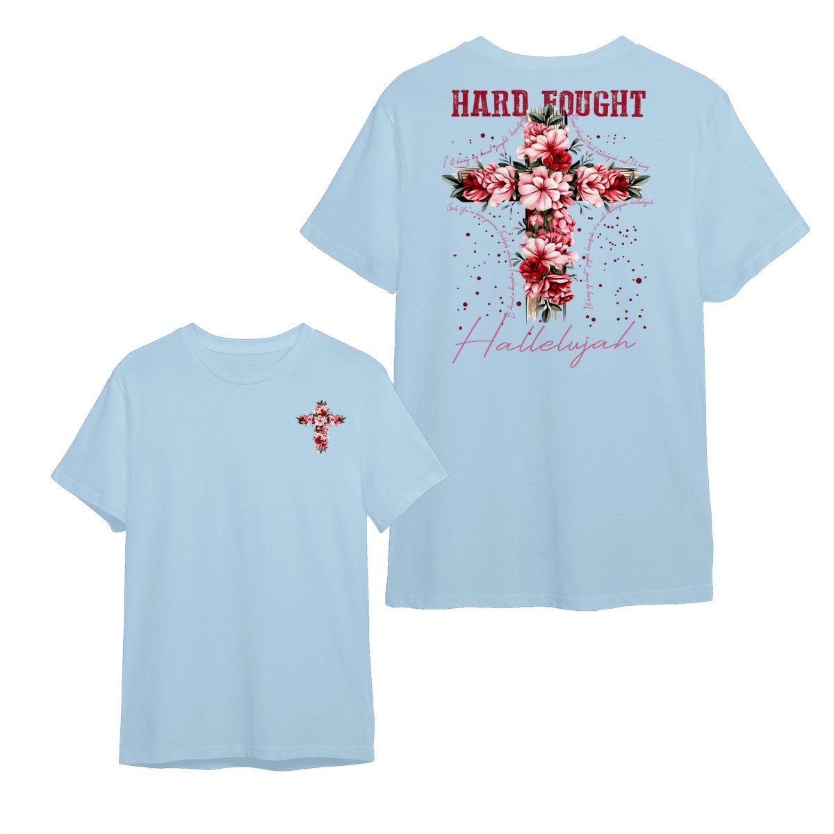 Are you looking for some special gift Hard Fought Hallelujah T-Shirt – Inspirational Floral Cross Graphic with Faith Message, Christian Gift Menswear Tee for your friends, your father, your mother, son, boyfriend, girlfriend? We have this idea for you. This product Hard Fought Hallelujah T-Shirt – Inspirational Floral Cross Graphic with Faith Message, Christian Gift Menswear Tee is perfect for you. Our T-shirt made of ringspun cotton for smoothness and body, and added rayon and polyester for extra stretch, drape, and breathability, this will be your new favorite t-shirt.