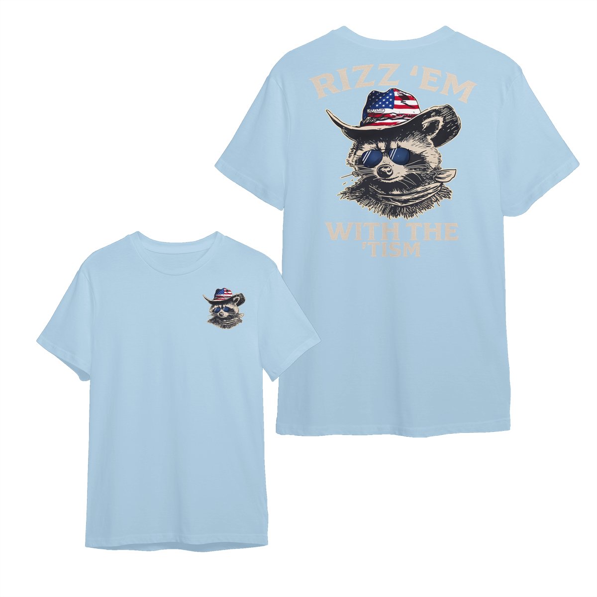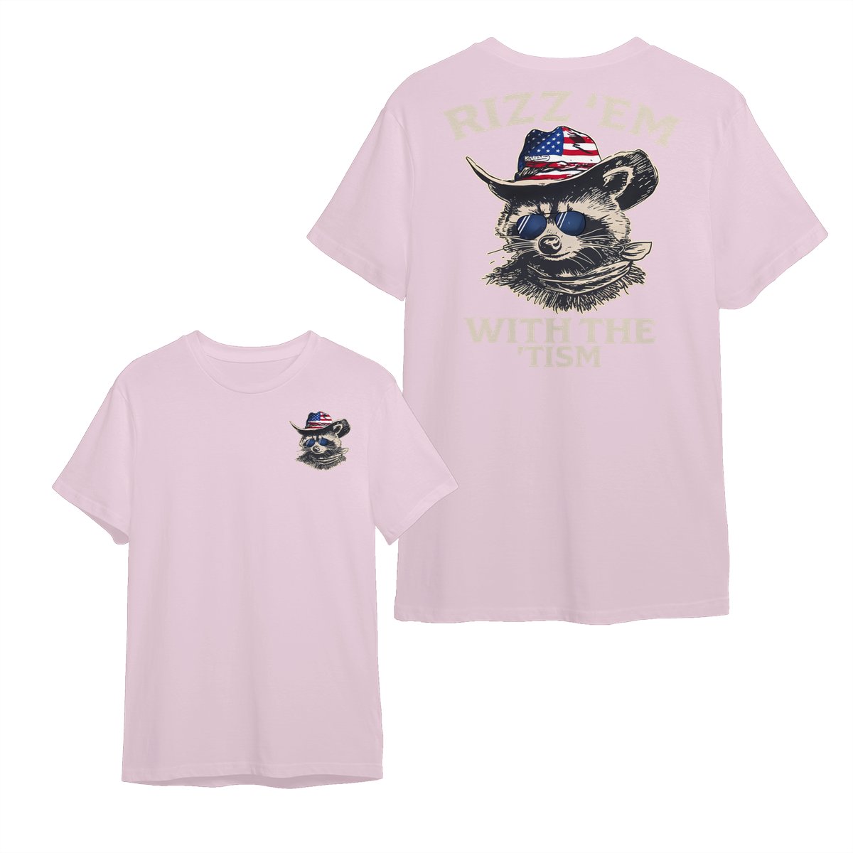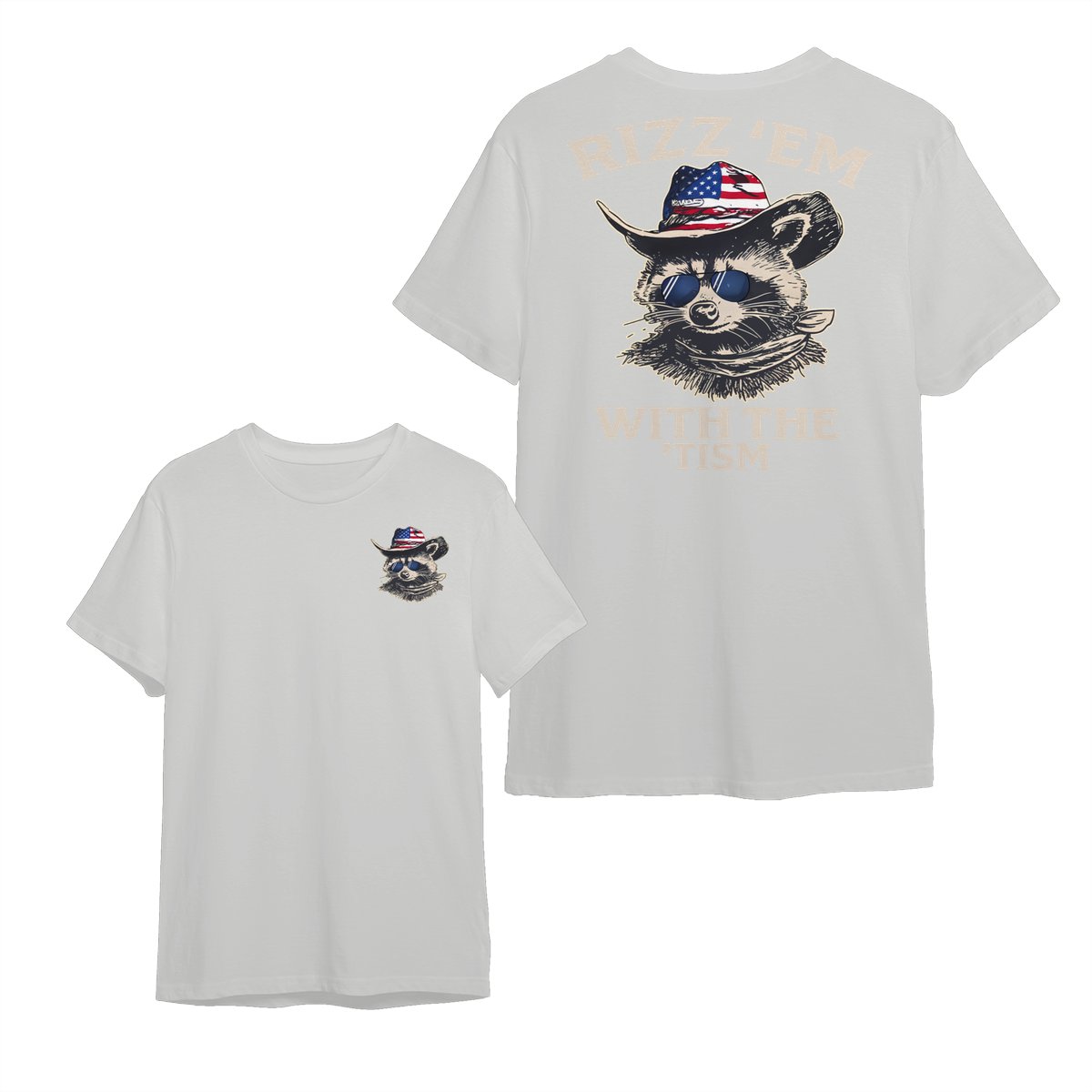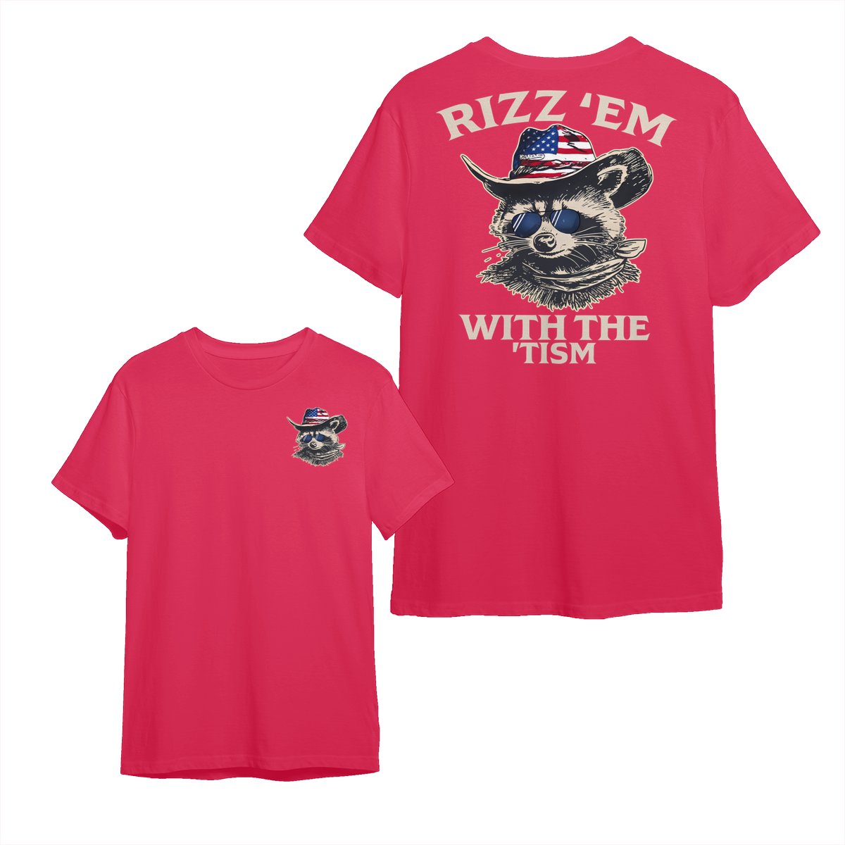 Rizz ‘Em With The ‘Tism T-shirt – Featuring A Raccoon Wearing An American Cowboy Hat and Sunglasses Shirt, Perfect for Outdoor Parties and Casual