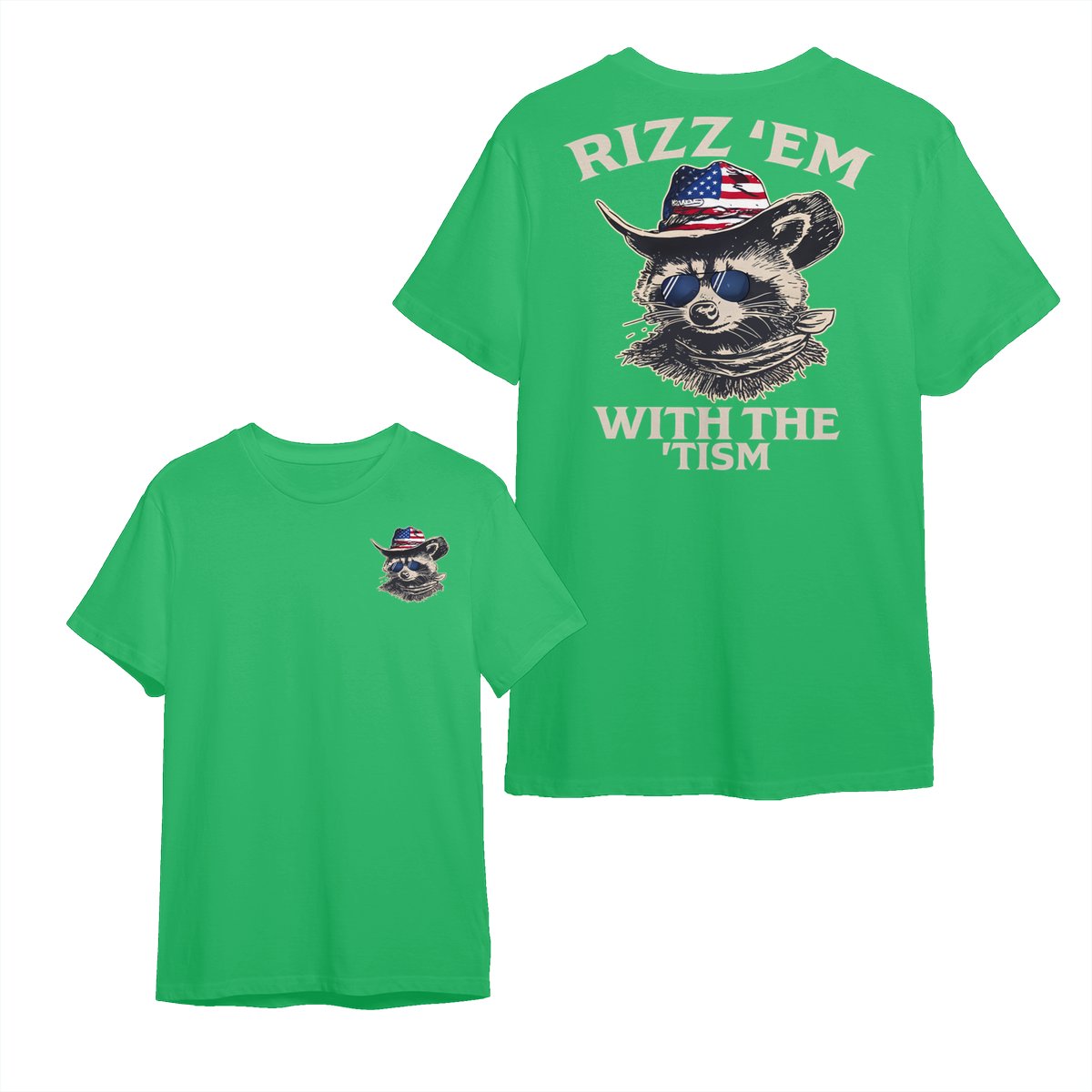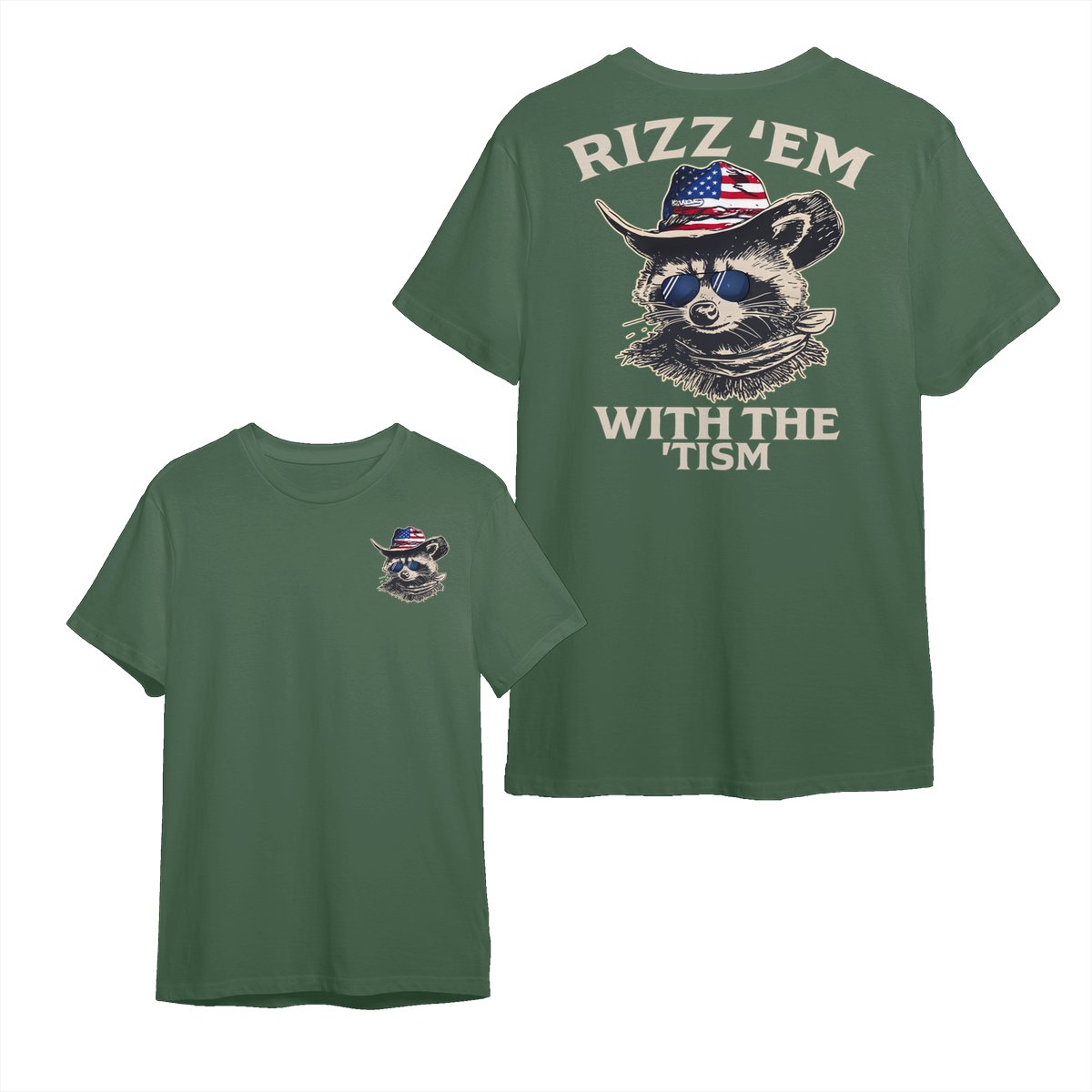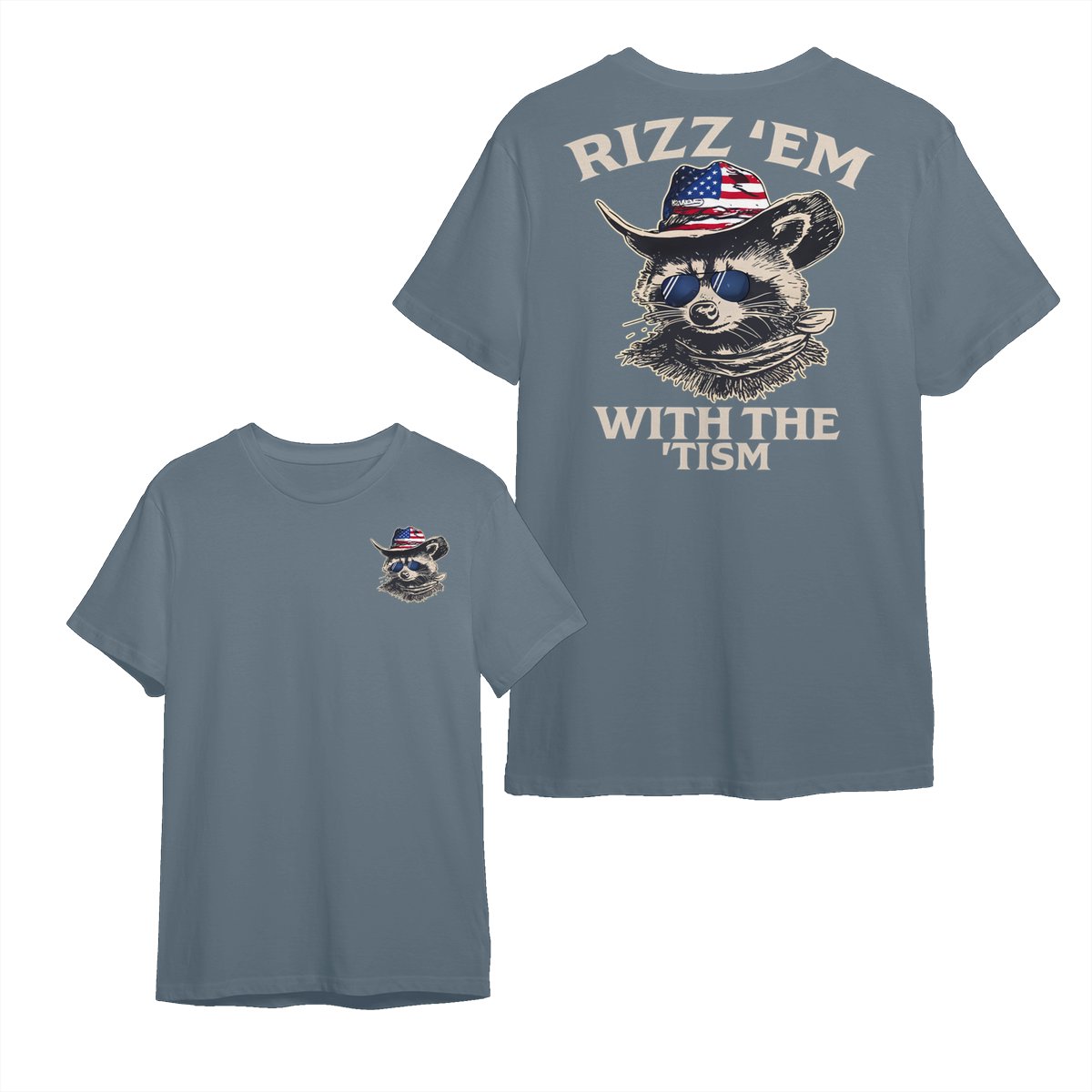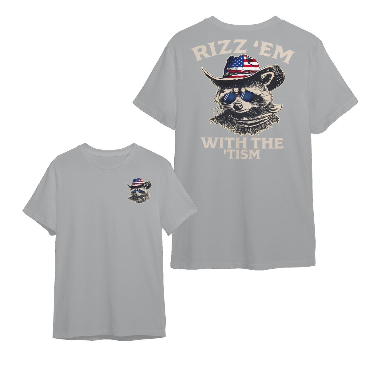 Rizz ‘Em With The ‘Tism T-shirt – Featuring A Raccoon Wearing An American Cowboy Hat and Sunglasses Shirt, Perfect for Outdoor Parties and Casual
